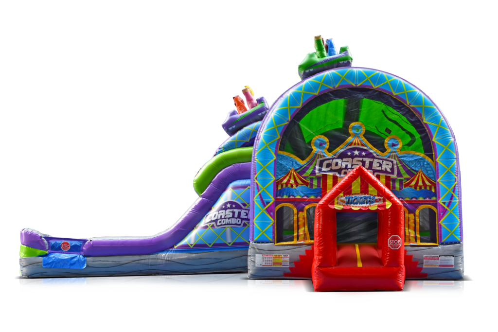 Check out our all NEW Roller Coaster Combo Bounce House….! This colorful Circus / Carnival themed inflatable will keep the kids busy for hours. Kids can jump, play, climb, slide and shoot hoops inside of this beautiful circus themed combo bouncer. It features a full size bounce area, climbing wall, and dual lane slide, as well as basketball hoop to play with. This combo has stunning graphics of a giant roller coaster with 3D coaster cars along the top. Its the perfect inflatable for your next circus or carnival themed party…! This Bouncer can be used WET or DRY.